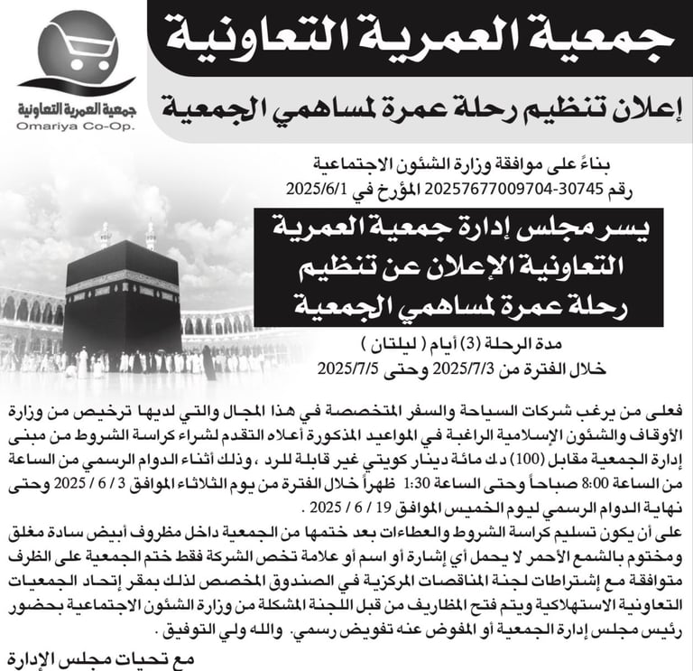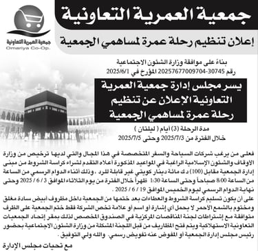 ويسر مجلس إدارة جمعية العمرية التعاونية أن يدعو الراغبين في أداء مناسك العمرة إلى المشاركة في هذه الرحلة المنظمة. وقد أكدت الجمعية أن هذا الإعلان يهدف إلى توفير فرصة للحجاج لأداء مناسك العمرة بسهولة ويسر.