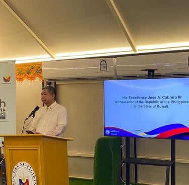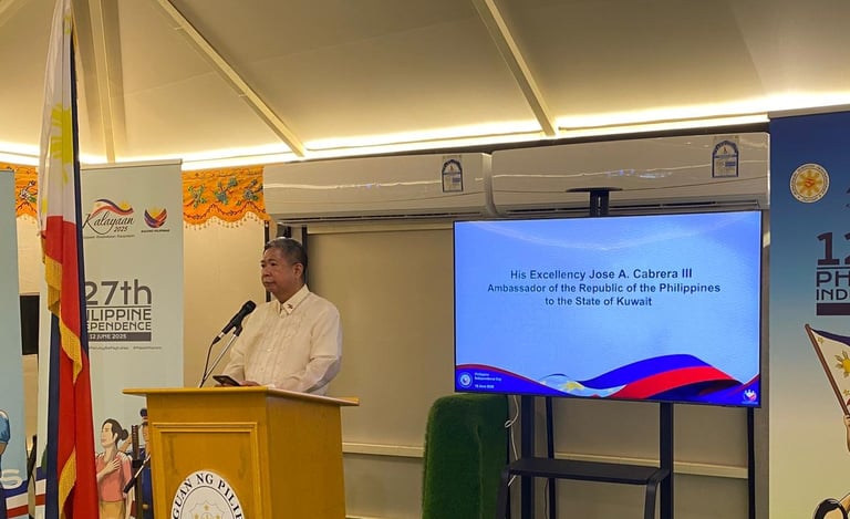ووجّه السفير كابريرا تهانيه الحارة إلى أبناء الجالية الفلبينية في الكويت وحول العالم بهذه المناسبة الوطنية، مؤكدًا على أهمية تضحيات الأجيال السابقة التي أسهمت في تحقيق الاستقلال، وعلى استمرار أبناء الشعب الفلبيني في السعي لبناء مستقبل أفضل يعمه السلام والتنمية المستدامة.