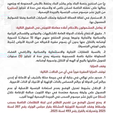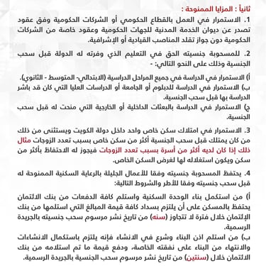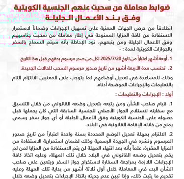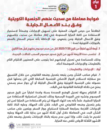 أعلنت وزارة الداخلية الكويتية عن ضوابط جديدة لمعاملة الأشخاص الذين سُحبت منهم الجنسية الكويتية بموجب بند "الأعمال الجليلة". وتأتي هذه الضوابط في إطار حرص الجهات المعنية على تسهيل إجراءاتهم وضمان استمرار كافة المزايا الممنوحة لهم في إطار معاملة من سحبت منهم جنسيتهم وفق هذا البند.