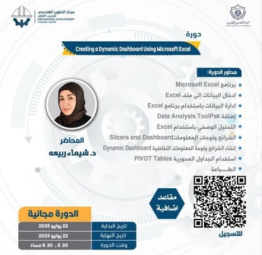 وتتناول الدورة محاور متعددة تهدف إلى تعزيز مهارات المشاركين في استخدام برنامج Excel لأغراض تحليل البيانات وعرضها، وتشمل: إدخال البيانات، وإدارة البيانات، إضافة Data Analysis ToolPak، التحليل الوصفي، استخدام الشرائح ولوحات المعلومات (Slicers and Dashboard)، إنشاء لوحات معلومات تفاعلية (Dynamic Dashboard)، استخدام الجداول المحورية (PIVOT Tables)، والطباعة.