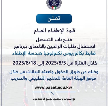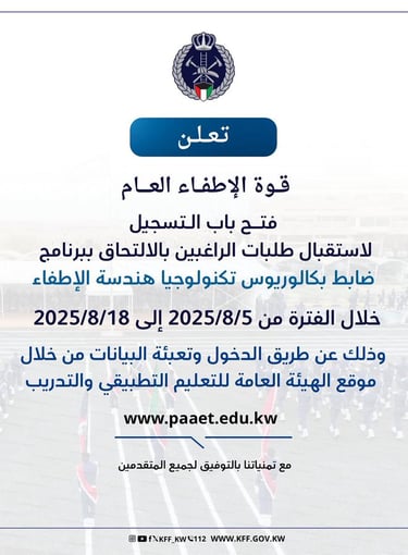 أعلنت قوة الإطفاء العام في الكويت عن فتح باب التسجيل لاستقبال طلبات الراغبين بالالتحاق ببرنامج "ضابط بكالوريوس تكنولوجيا هندسة الإطفاء".