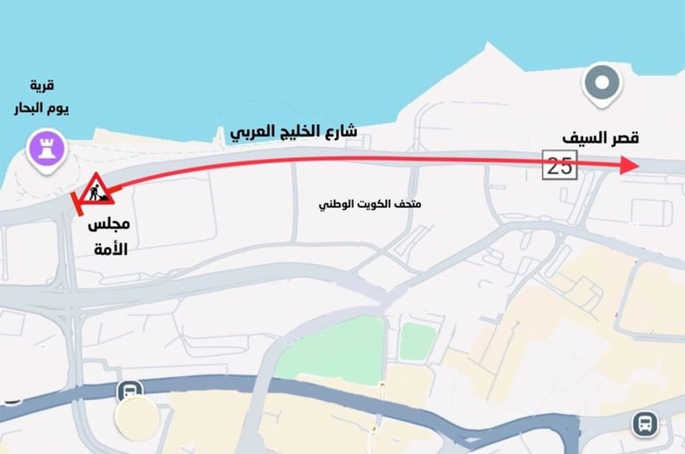 سيتم إغلاق المسار الأيسر والمسار الأوسط من شارع الخليج العربي، في الجزء الممتد من تقاطع مجلس الأمة وحتى دوار قصر السيف. ويبدأ هذا الإغلاق من يوم الاثنين الموافق 4 أغسطس 2025، ويستمر حتى 1 سبتمبر 2025.