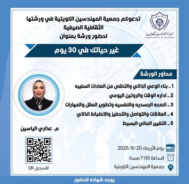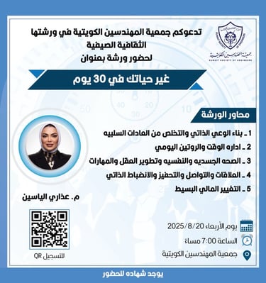أعلنت جمعية المهندسين الكويتية عن دعوتها لحضور ورشة عمل ثقافية صيفية بعنوان «غير حياتك في 30 يوم»، تقدمها المهندسة عذاري الياسين.