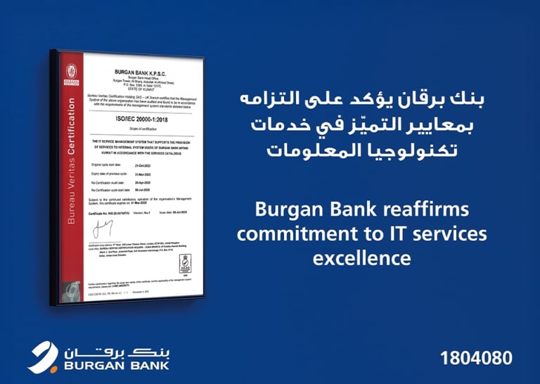 أعلن بنك برقان عن حصوله على تجديد لشهادة الآيزو ISO/IEC 20000-1:2018 الخاصة بنظام إدارة خدمات تكنولوجيا المعلومات. ويأتي هذا الإنجاز تأكيداً لنجاح مسيرة التحول الرقمي المستمرة التي ينتهجها البنك، ويعكس متانة بنيته التحتية الرقمية وتوافقها مع أعلى المعايير العالمية المعتمدة في هذا المجال.