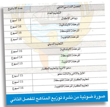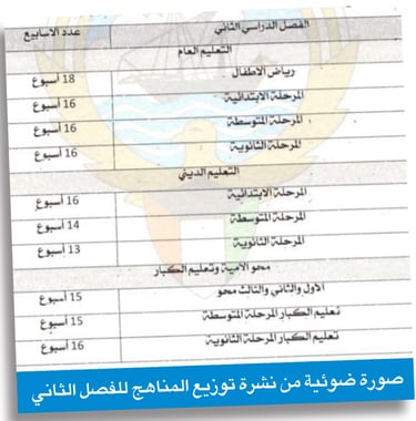 انتهت الجهات المختصة في وزارة التربية من إعداد خطة توزيع المناهج الدراسية للفصل الدراسي الثاني للعام 2026/2025، حيث تراوحت مدة الدراسة بين 13 أسبوعاً و18 أسبوعاً حسب المرحلة التعليمية