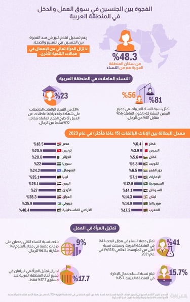 يشير التقرير إلى أن النساء يُشكلن 48.3% من سكان المنطقة العربية، لكن مشاركتهن الاقتصادية لا تزال ضعيفة مقارنة بالرجال. وبحسب التقديرات، فإن سد الفجوة في المشاركة بسوق العمل بين الجنسين قد يستغرق نحو 115 عاماً إذا استمرت الوتيرة الحالية.
