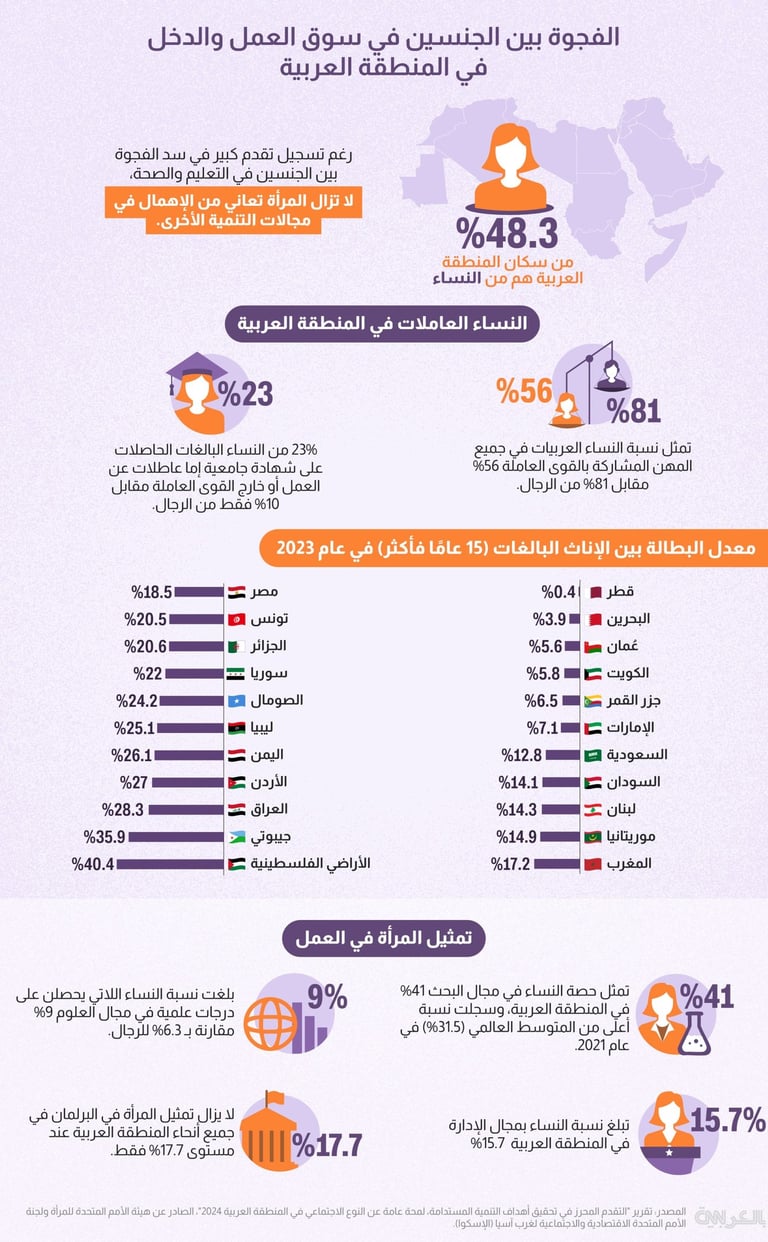 في تقرير مشترك صدر مؤخرًا عن هيئة الأمم المتحدة للمرأة ولجنة الإسكوا تحت عنوان "التقدّم المحرز في تحقيق أهداف التنمية المستدامة – لمحة عامة عن النوع الاجتماعي في المنطقة العربية 2024"، كشفت النتائج عن فجوات مقلقة بين الجنسين لا تزال قائمة في سوق العمل والدخل في المنطقة العربية، رغم التقدّم المحرز في قطاعات التعليم والصحة.