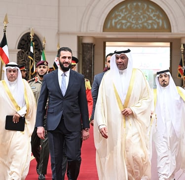 وصل صباح اليوم رئيس الجمهورية العربية السورية أحمد الشرع والوفد الرسمي المرافق له إلى البلاد في زيارة رسمية، يجري خلالها مباحثات رسمية مع حضرة صاحب السمو أمير البلاد الشيخ مشعل الأحمد الجابر الصباح.
